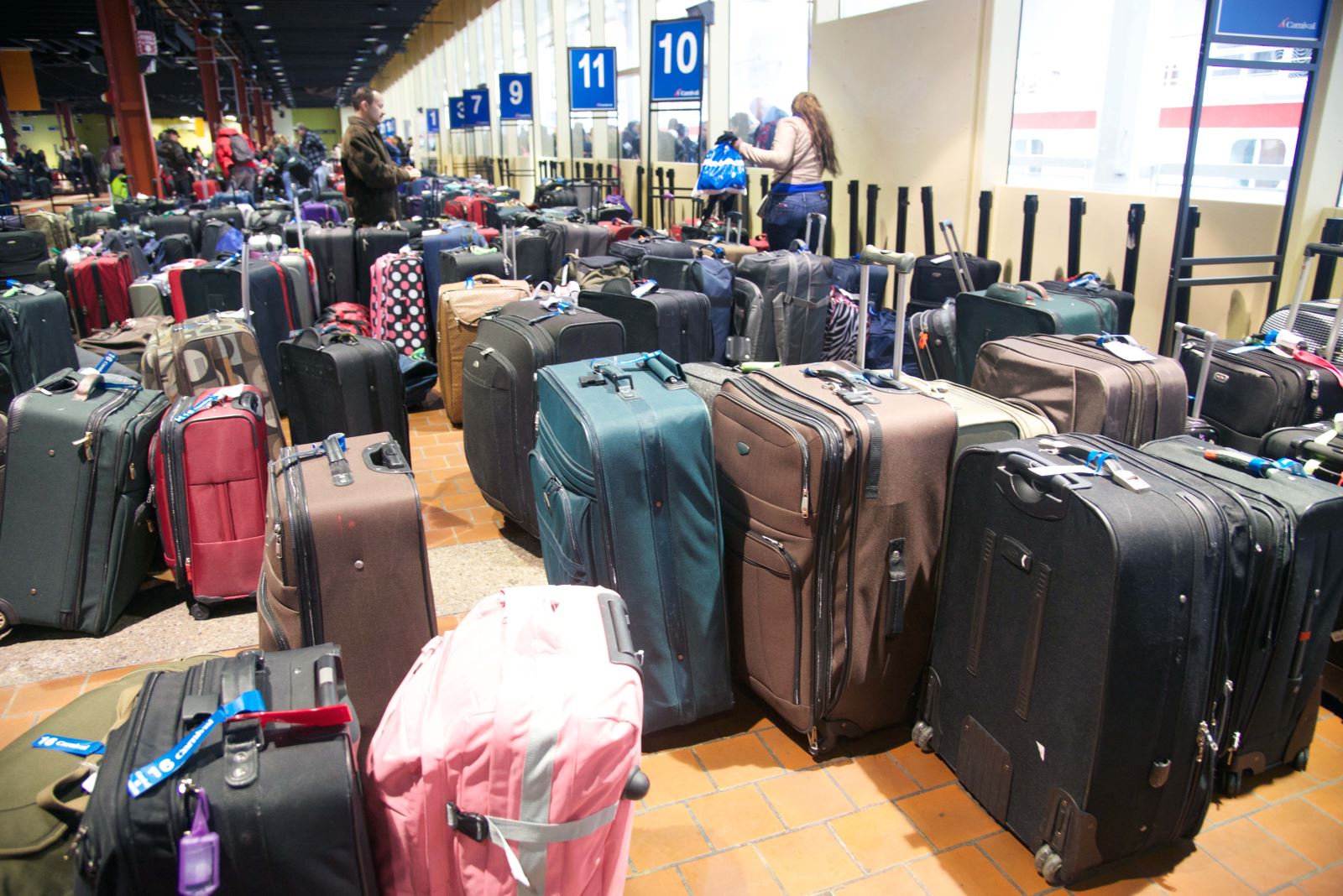 Luggage from passengers await pickup as many who have just enjoyed a cruise now seek to spend time overnight in New York as tourists.