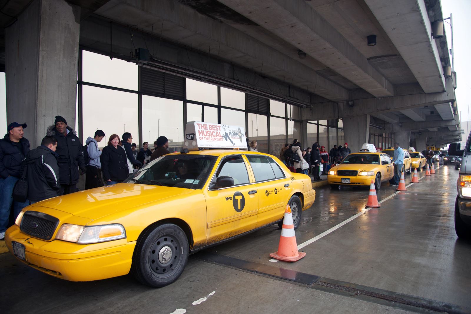 Taxis line up at the cruise terminal, part of the city's transportation system that benefits from passengers arriving and departing by sea.